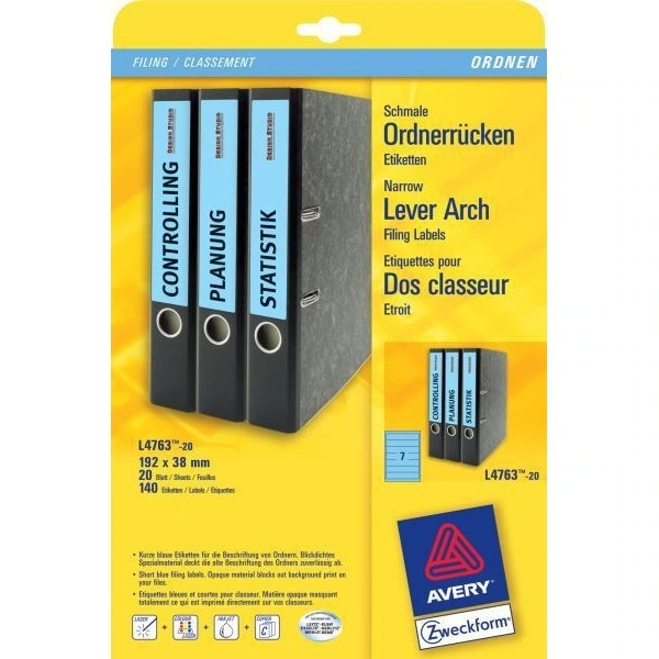 Bedruckbare Rückenschilder bieten Ihnen zahlreiche Möglichkeiten zum Organisieren und Beschriften Ihrer Akten. Die Rückenschilder von AVERY Zweckform kommen vorgestanzt und mit der Option zum Bedrucken zu Ihnen. Egal ob im Büro, im Lager oder auch zu Hause – die Rückenschilder sorgen für eine übersichtliche Kennzeichnung Ihrer Akten.