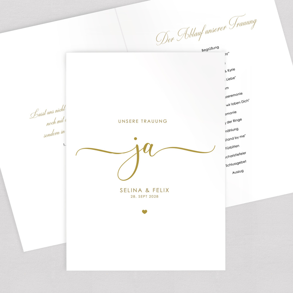 Erstellt euren individuelles Trauheft mit eurem Trauablauf auf der Innenseite oder nutzt den Umschlag, um ihn mit selbst gedruckten Einlegern zu ergänzen.